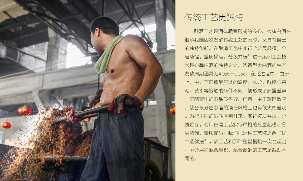 濃香型心酒的釀制過程中將高溫大曲和中溫大曲按比例混合使用。它對形成心酒的典型風(fēng)格起著關(guān)鍵的作用。高溫大曲中有耐高溫細(xì)菌,高含量的酸性蛋白酶,種類繁多的微生物種,復(fù)雜的酶系,呈香呈味物質(zhì)豐富,它是心酒呈現(xiàn)香氣濃郁、復(fù)合香較好的重要條件。低溫入窖與緩慢發(fā)酵是心酒生產(chǎn)的工藝控制點(diǎn), 有利于醇甜物質(zhì)的形成,有利于控酸產(chǎn)酯,有利于控制高級醇的形成,有利于加速新窖老熟。入池溫度的高低是正常發(fā)酵的首要條件。如果入池溫度過高,會(huì)使糧糟糖化發(fā)酵升溫快,打擾糖化與發(fā)酵作用的協(xié)調(diào);糖化速度高于發(fā)酵速度,造成糖分的積累;給大量產(chǎn)酸菌的生長、繁殖和代謝創(chuàng)造了一個(gè)良好環(huán)境,造成酒醅酸度升高,影響白酒的質(zhì)量,更不利于下排配料。同時(shí),由于糖分消耗過多,變成酸味物質(zhì),也會(huì)降低白酒產(chǎn)量。若入池溫度過低,也不利于有益釀酒微生物的生長繁殖,使釀出的白酒香味短、酒味淡、產(chǎn)量低等。因此,發(fā)酵規(guī)律依然遵循“前緩、中挺、后緩落”。