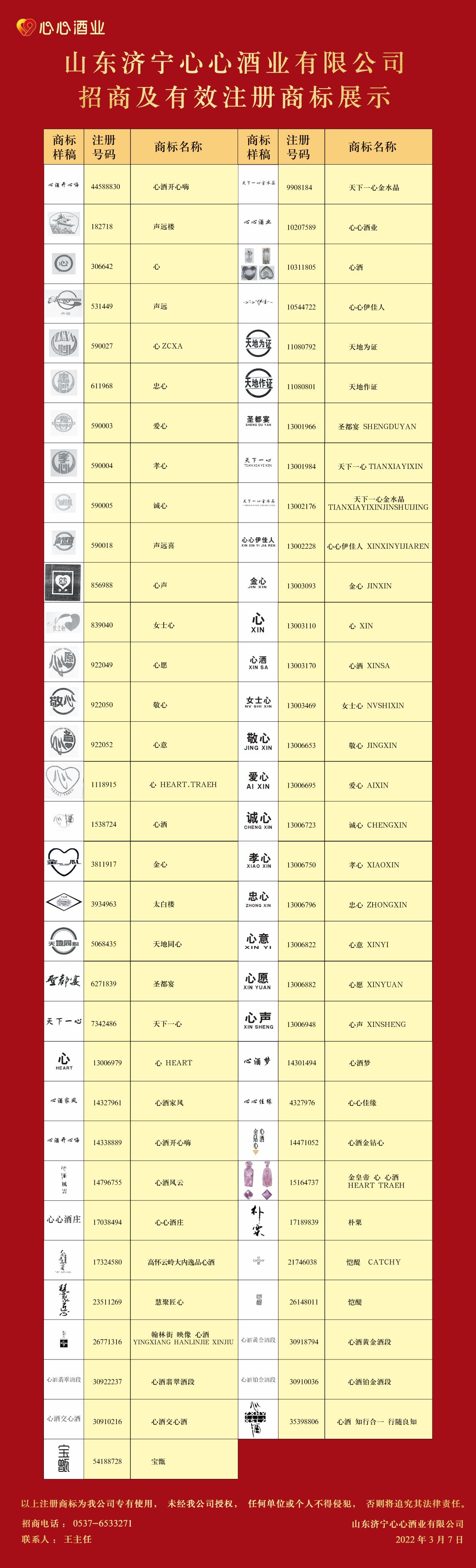 山東濟(jì)寧心心酒業(yè)有限公司招商及有效注冊(cè)商標(biāo)展示