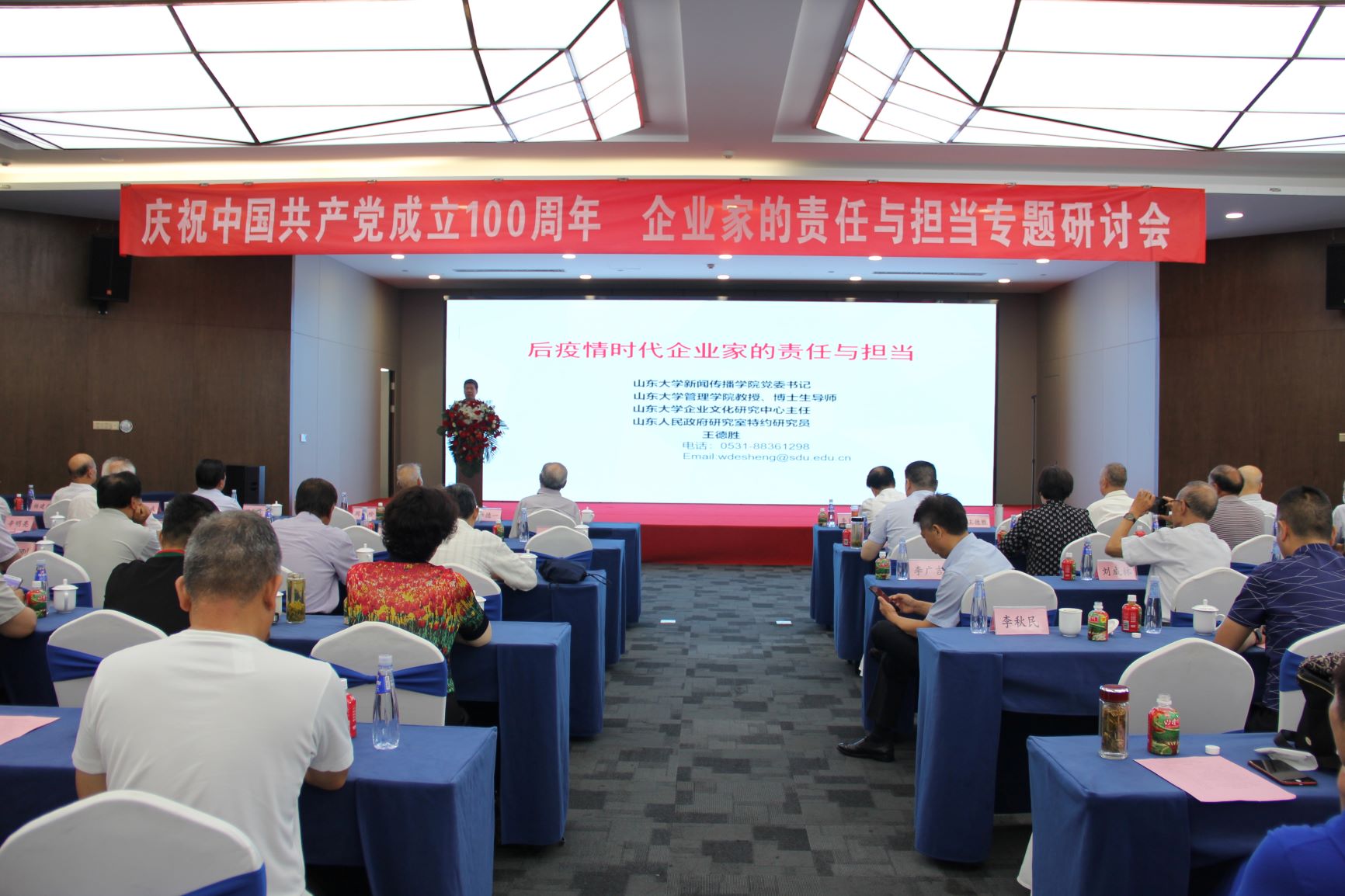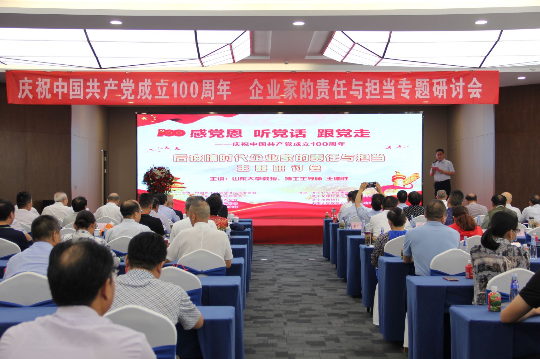 專題研討會(huì)上,濟(jì)寧市國際國內(nèi)公共關(guān)系協(xié)會(huì)會(huì)長、山東大學(xué)濟(jì)寧校友會(huì)理事長韓宇以《后疫情時(shí)代企業(yè)家的責(zé)任與擔(dān)當(dāng)》為主題進(jìn)行了分享。重點(diǎn)分析了后疫情時(shí)代復(fù)雜多變的國際國內(nèi)形勢(shì),剖析我國的應(yīng)對(duì)策略,強(qiáng)調(diào)了企業(yè)家在經(jīng)濟(jì)發(fā)展中的重要作用,明確了企業(yè)家的責(zé)任與擔(dān)當(dāng)。企業(yè)家在推動(dòng)高質(zhì)量發(fā)展,深化供給側(cè)結(jié)構(gòu)性改革,推動(dòng)改革創(chuàng)新,實(shí)現(xiàn)產(chǎn)業(yè)基礎(chǔ)高級(jí)化、產(chǎn)業(yè)鏈現(xiàn)代化,加快培育完整內(nèi)需體系等方面,肩負(fù)著重要的歷史責(zé)任!弘揚(yáng)企業(yè)家精神,是企業(yè)家實(shí)現(xiàn)責(zé)任和擔(dān)當(dāng)?shù)暮诵呐c強(qiáng)大的動(dòng)力!